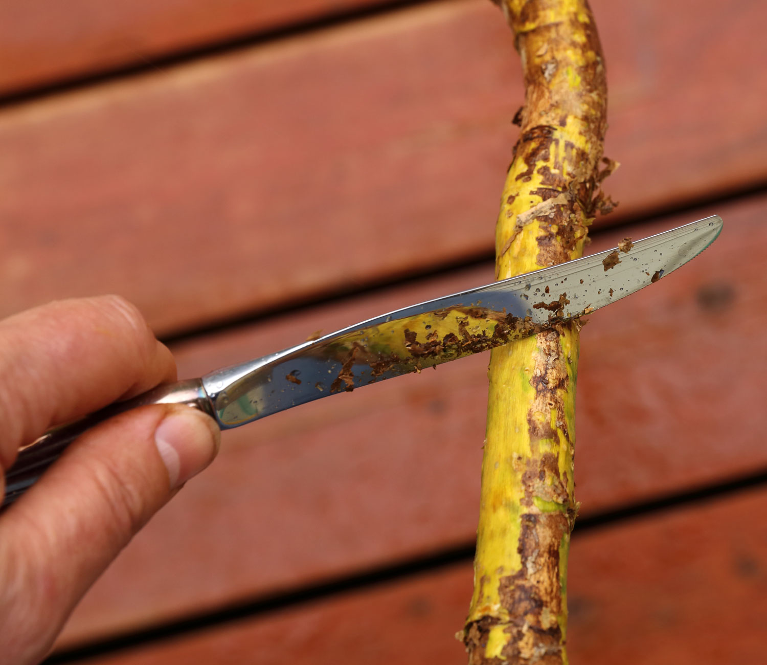 A stainless steel scrubber works well to take the brown, outer bark off.